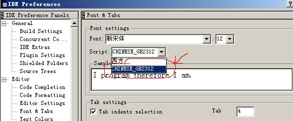 2、 在IDE Preferences对话框中选中:Editor->Font&Tabs. 将ADS默认的字体Courier该成我们你喜欢的任何一种中文字体就行,关键是在Script右侧的下拉列表框中选中CHINESE-GB2312就可以了。