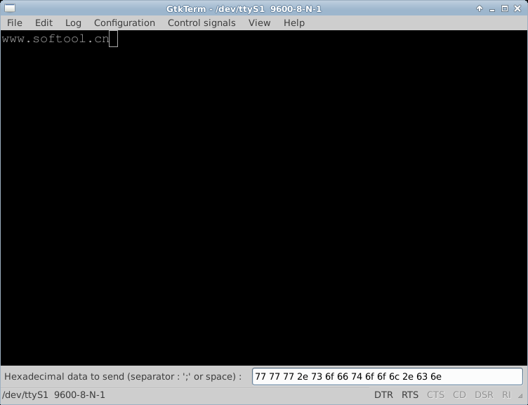 在 Windows 打开串口调试助手,然后按照 ASCII格式发送: www.softool.cn ,下图则是在 Ubuntu 中接收到的字符串: