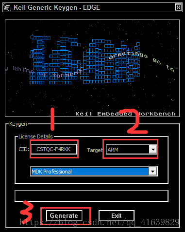 运行光盘 MDK5 目录下的 keygen.exe(如果杀毒软件误报误杀,那就先关了杀毒软件,再解压),在 keygen.exe 里面,设置 Target为 ARM(下图2处),拷贝 MDK License Management 界面里面的 CID 号,到 keygen.exe 里面 CID栏(下图1处),点击: Generate(下图3处),即可获得注册码 。