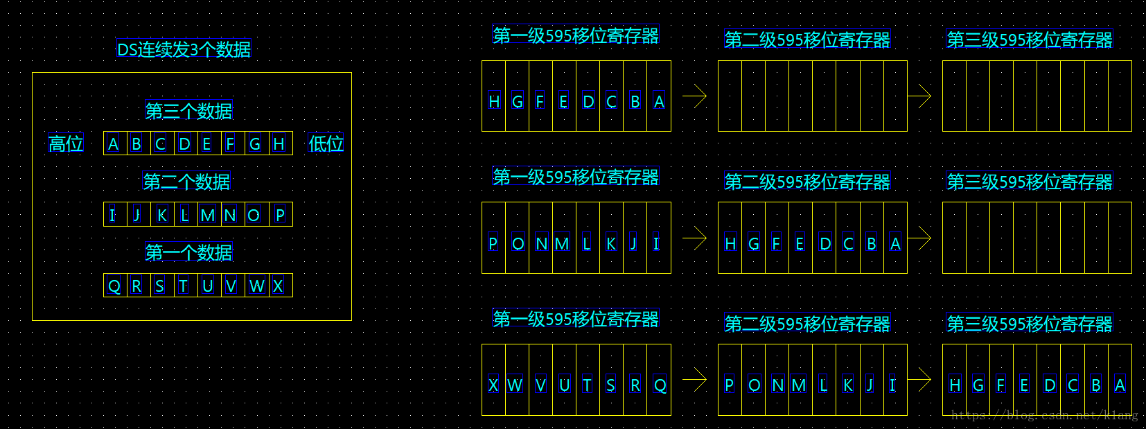 假如往第一级的595连续发三个字节数据:ABCD EFGH、IJKLP MNOP、QRST UVWX,第一个字节ABCD EFGH先进入第一级595移位寄存器;
